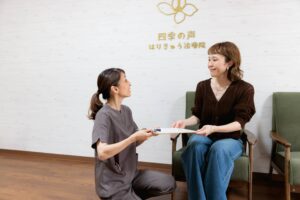 施術後に担当スタッフから「本日の施術内容やお身体の状態」「通う頻度や回数」「セルフケア」「施術後の過ごし方」などのお話しをさせていただきます。